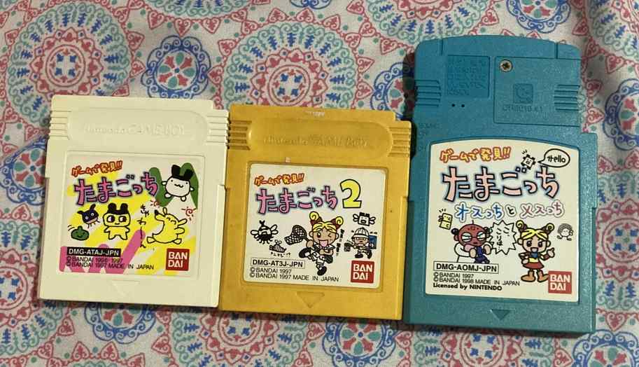 my Tamagotchi GBA games! got these around 2021-2022, i remember i found them in a mall, and despite the section of the mall that they were at having a large selection of japan-imported toys (mostly pokemon stuff), i picked them instantly out of excitement. i don't usually make desicions like that so quickly, but it was Tamagotchi so it's fine. i don't have a GameBoy to play them on yet, but i don't regret the purchase one bit!